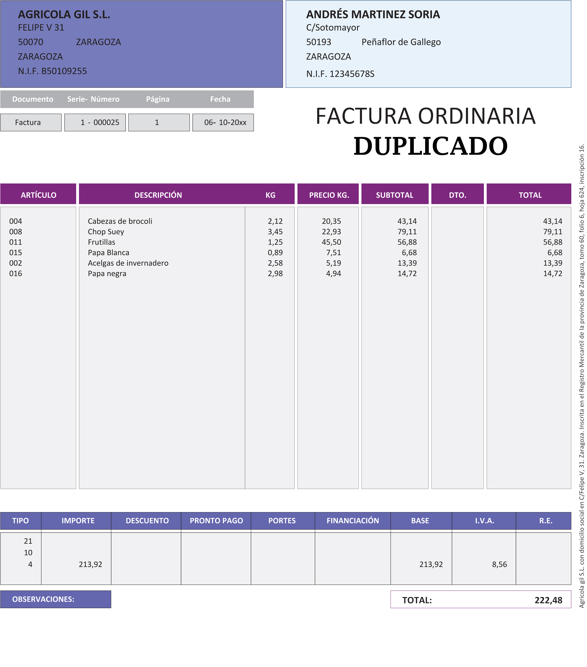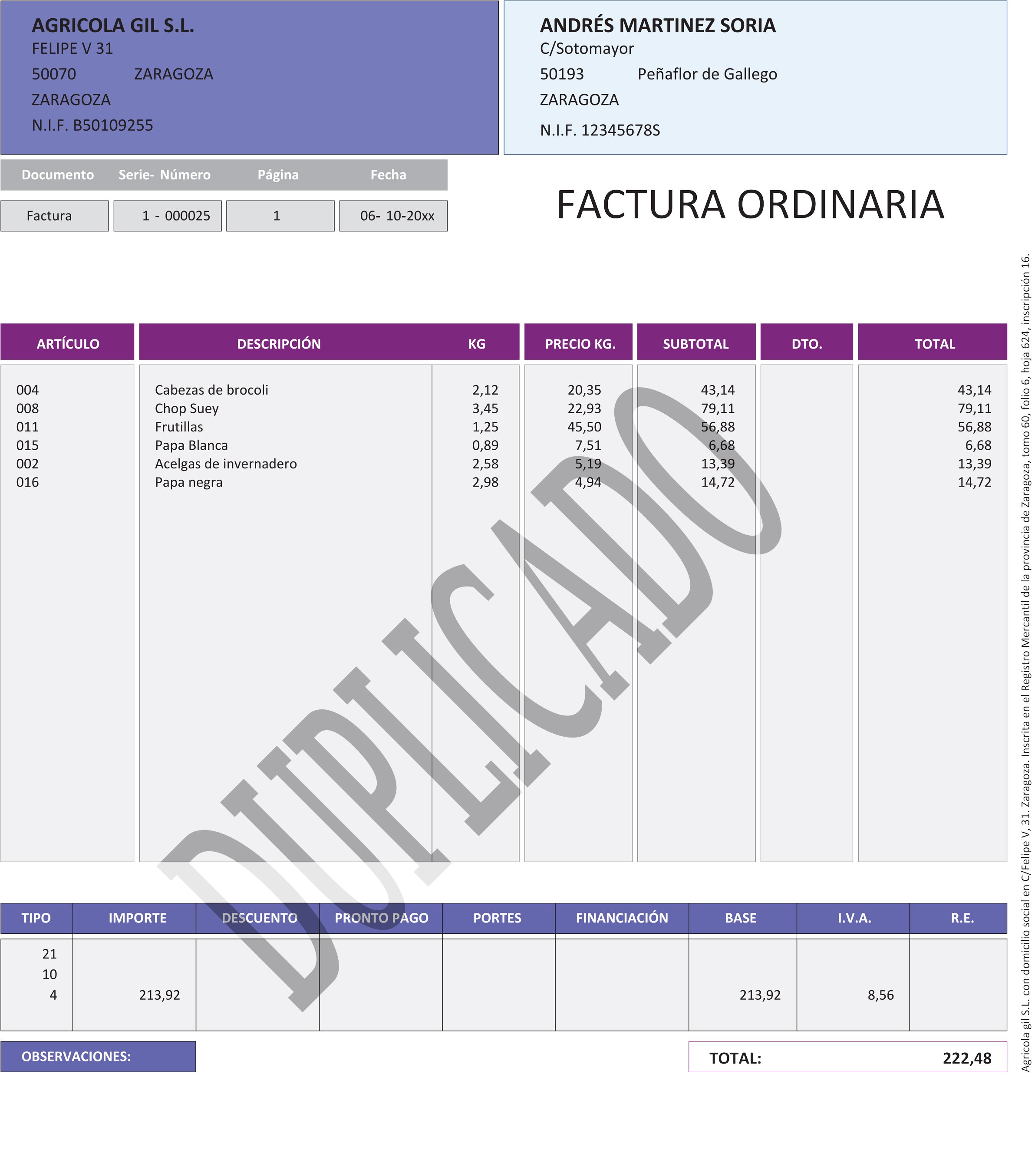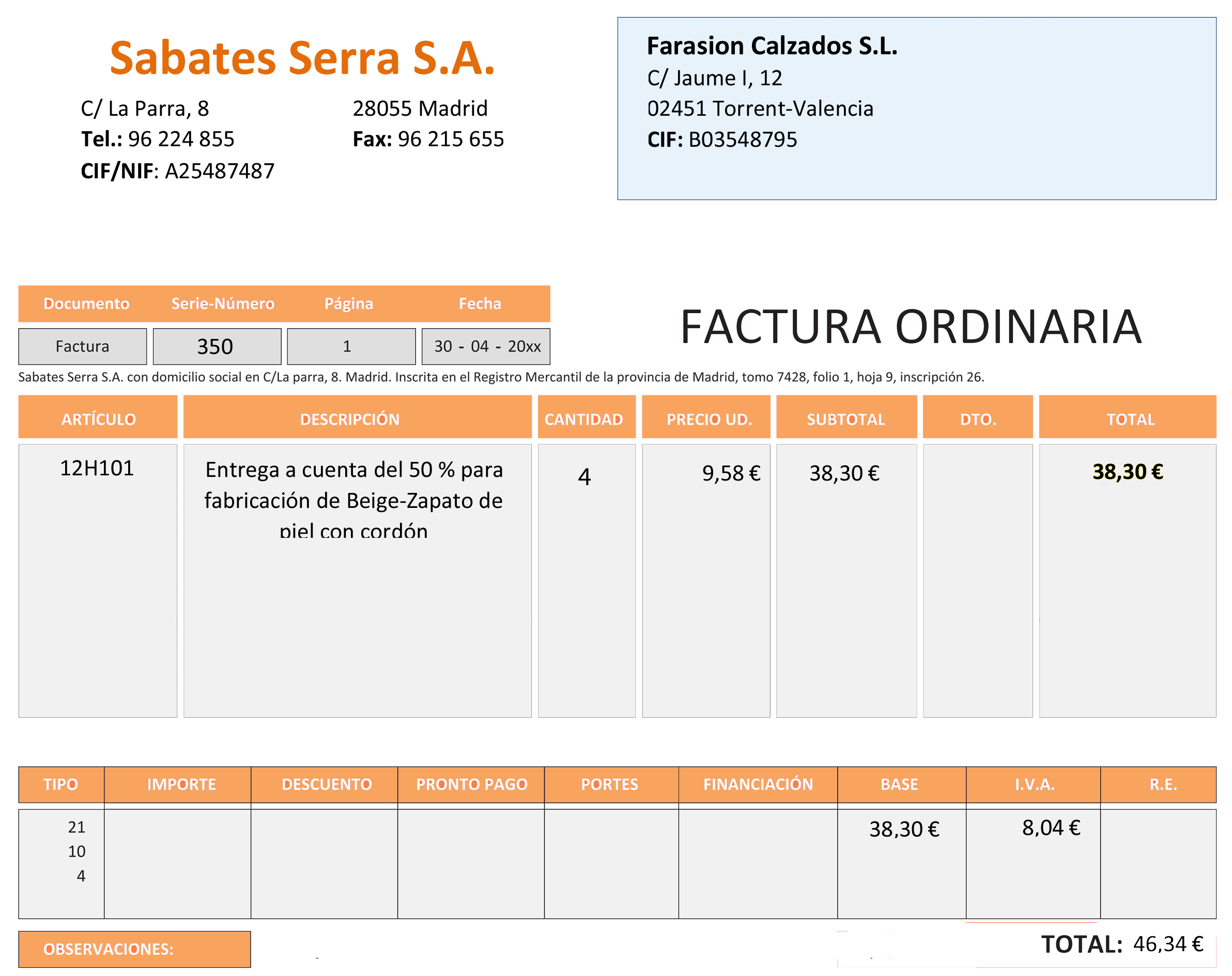En la factura del ejemplo siguiente se puede ver como se ha entregado una determinada cantidad para la fabricación de un producto, evidenciando que se trata de un anticipo, que además, anticipa el IVA al llevarlo incorporado en la misma factura.