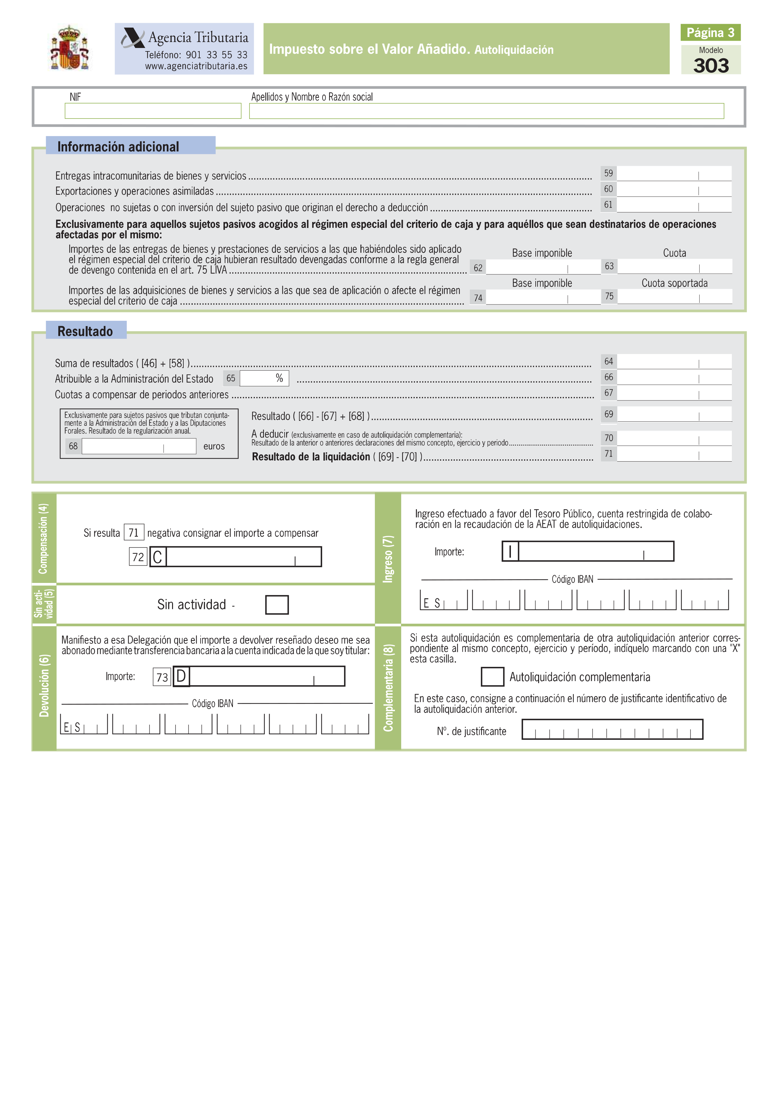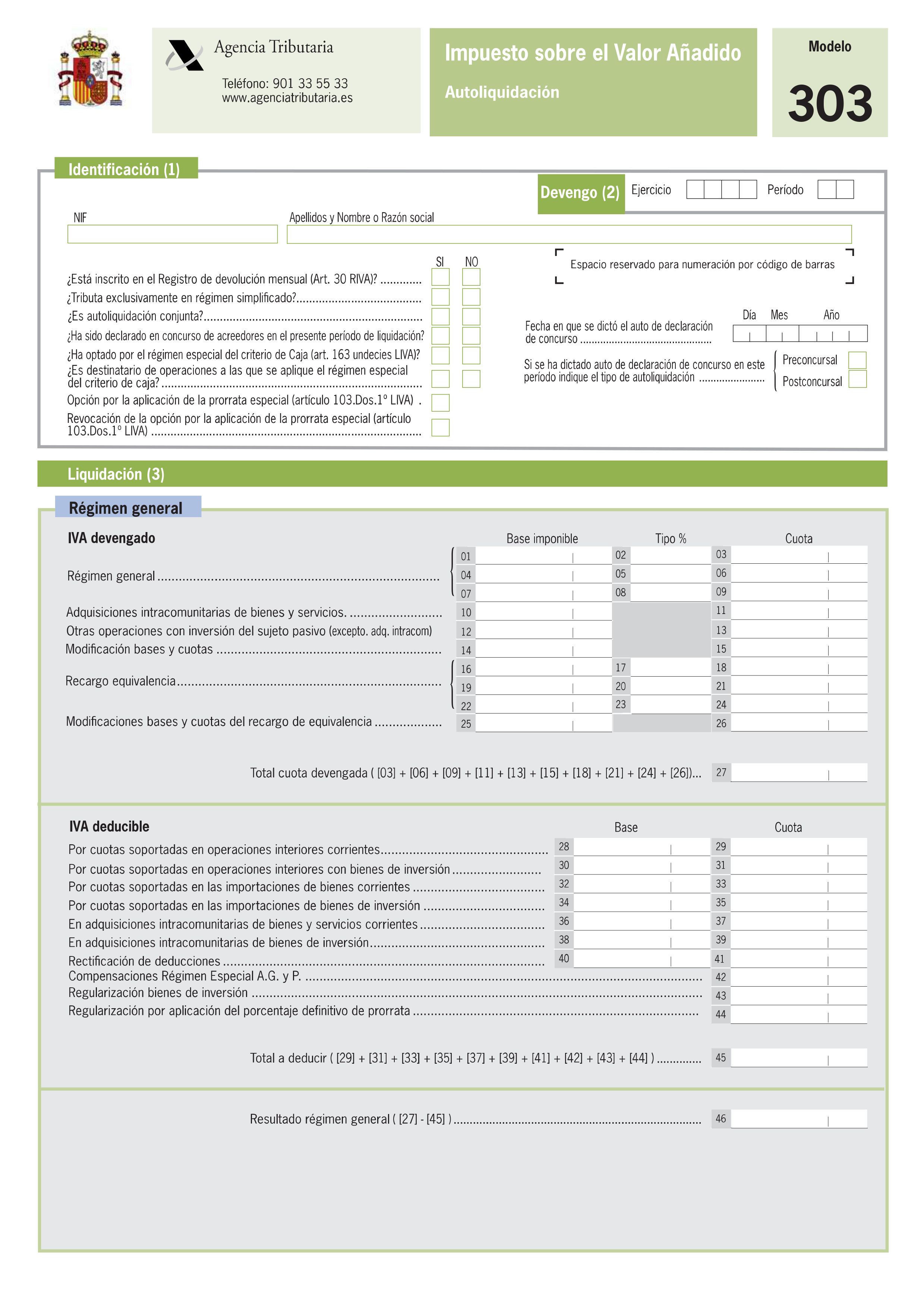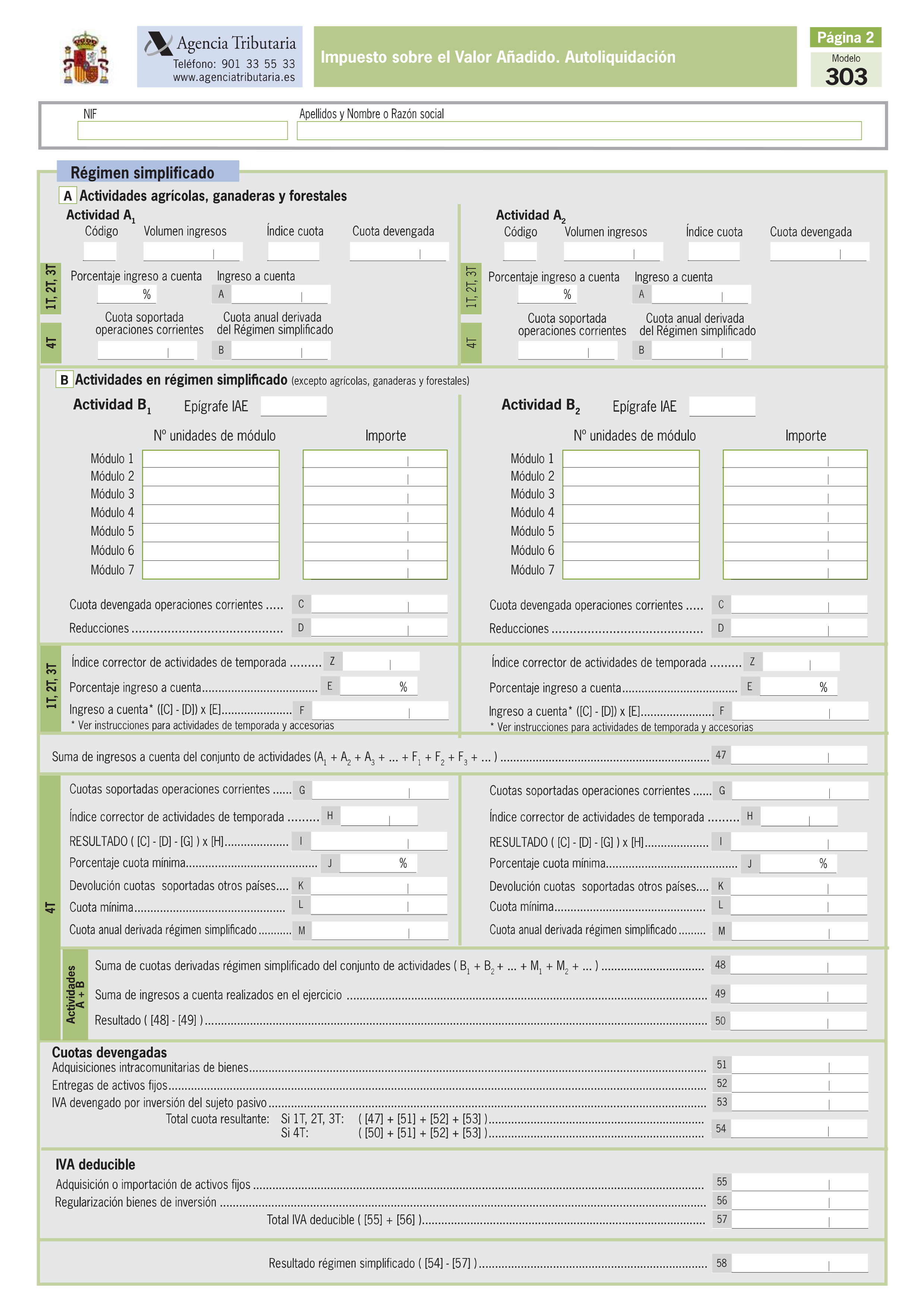 El modelo 303 es la declaración periódica de IVA que sirve para las empresas que declaran mensualmente o trimestralmente. En el caso de declaraciones trimestrales, este modelo se presentará durante los 20 primeros días del mes siguiente al trimestre que se está liquidando, es decir, se deberán presentar cuatro declaraciones trimestrales en el modelo 303 en los siguientes plazos: los tres primeros trimestres entre el 1 y el 20 de los meses de abril, julio y octubre y el cuarto trimestre entre el 1 y el 30 del mes de enero del año siguiente.