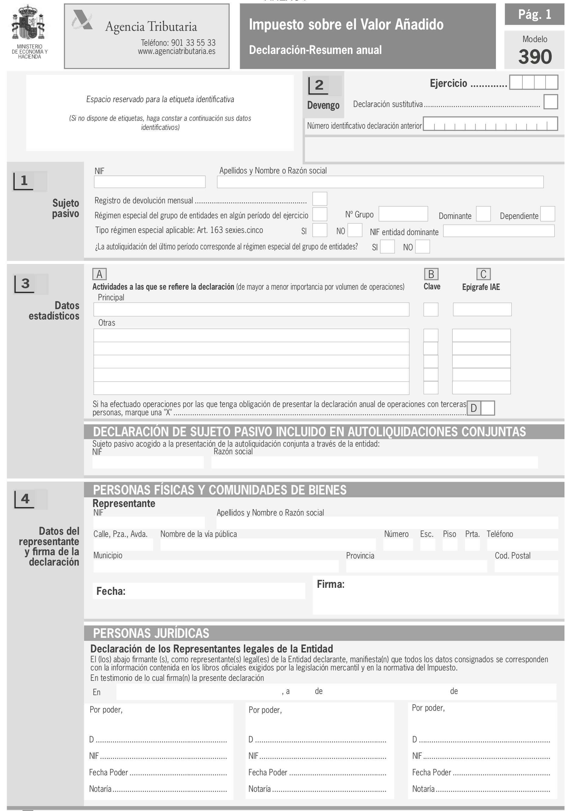 El modelo 390 es el resumen anual de IVA. Se presenta junto con la última declaración del año. Consiste en un resumen en el que se recopilan todos los datos declarados en los modelos 303 de todo el año. El último trimestre del modelo 303 deberá presentarse de forma simultánea con la Declaración Resumen Anual, modelo 390.