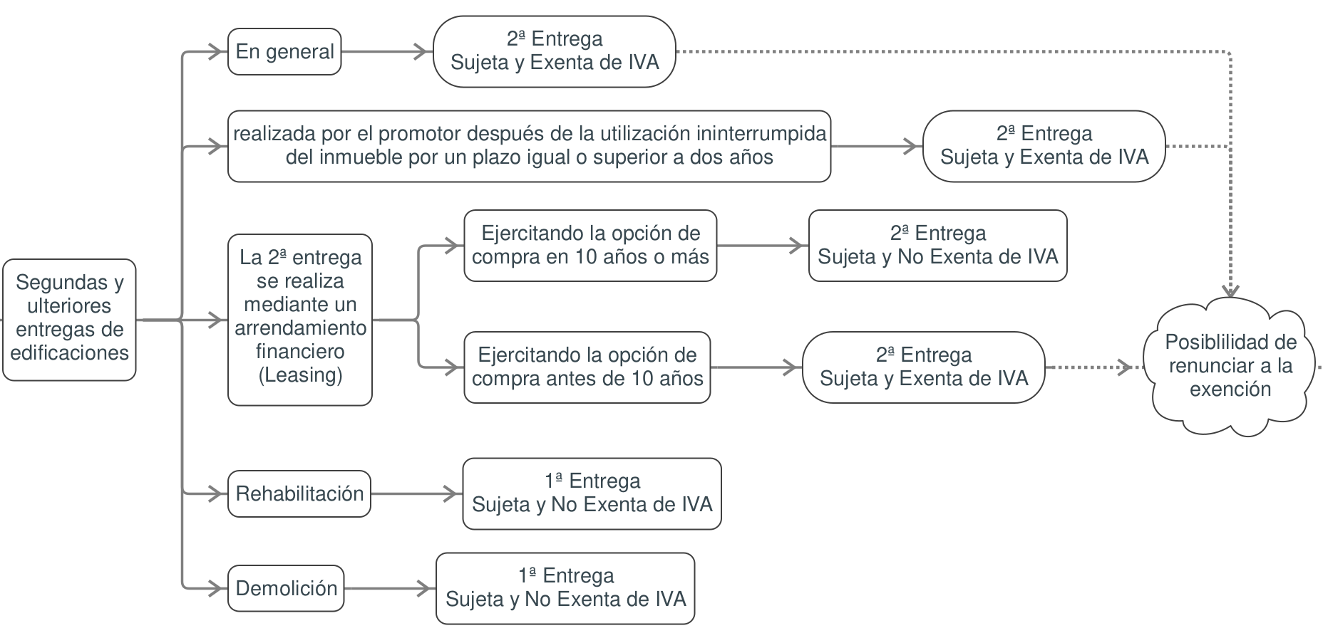 Tanto en las entregas de terrenos rústicos o no edificables, así como en las segundas entregas, en general o para los casos concretos en los que la segunda entrega se realice a través de un arrendamiento financiero cuya opción de compra se ejercite antes de los 10 años, quedarán sujetas y exentas de IVA, lo que implica que tributarán en el Impuesto de Transmisiones Patrimoniales, el cual no es deducible.