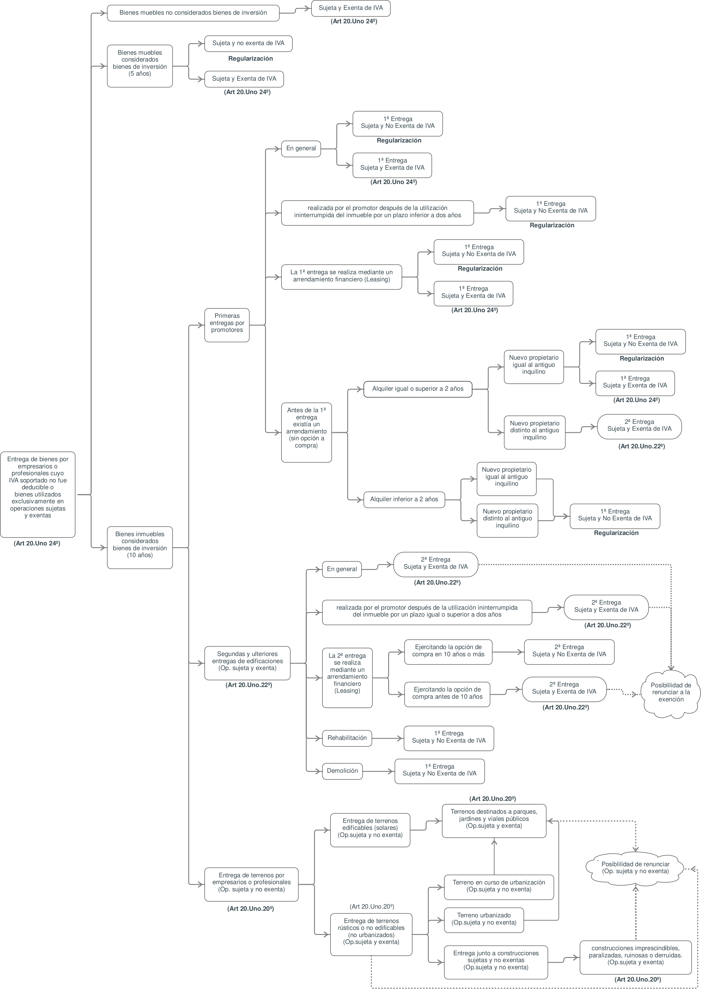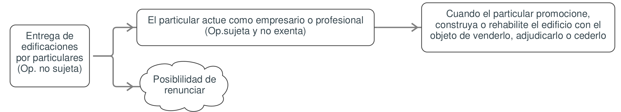 Esta misma operación, en principio quedaría recogida en el artículo 20.Uno.24º al tratarse de la entrega de bienes utilizados por el transmitente en operaciones sujetas y exentas y a quien no se le atribuyó el derecho a la deducción del IVA soportado, pero el propio artículo 20.Uno.24º elimina la posibilidad de que ambas operaciones queden sujetas y exentas simultáneamente por ambos artículos, teniendo preferencia el artículo 20.Uno.22º, dejando de esta forma la posibilidad de renunciar a la exención del artículo 20.Uno.22º para poder tributar por IVA y no por transmisiones patrimoniales a aquellos empresarios o profesionales cuyo IVA soportado es deducible.