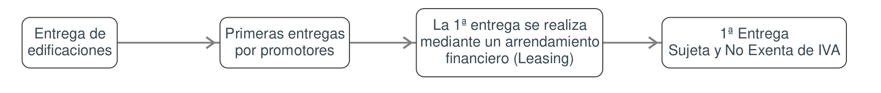 Pongamos por ejemplo el caso de un promotor de viviendas, que una vez finalizada la construcción se plantea la posibilidad de que parte de sus viviendas se vendan mediante un arrendamiento financiero con opción a compra (leasing). Se presupone que al finalizar el contrato de arrendamiento se va a ejercitar la opción de compra ya que el precio al que podrá adquirir el bien será muy inferior al que tendría en el mercado, con lo cual no ejercitar dicha opción sería poco probable. En este caso, el ejercicio de la opción de compra se consideraría primera entrega sujeta y no exenta de IVA, de la misma forma que las cuotas por arrendamiento que se paguen a lo largo del contrato quedarían sujetas y no exentas de IVA.
