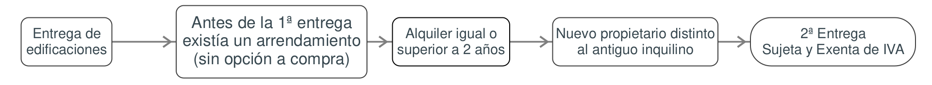 Si finalmente y aun siendo una mala decisión desde el punto de vista económico, el arrendatario confirmase la intención de no ejercitar la opción de compra, todas las cuotas por arrendamiento pasarían a estar sujetas y exentas de IVA ya que a partir de ese momento sería un arrendamiento de vivienda sujeto y exento.La situación contraria se podría dar en el caso en el que el promotor primeramente hubiera arrendado la vivienda más de dos años seguidos a un inquilino y posteriormente decida desprenderse de la misma mediante la firma de un contrato de arrendamiento financiero (leasing) con un propietario distinto del antiguo inquilino cuya intención es la de ejercer la opción de compra. En este caso, la entrega del bien mediante el ejercicio de la opción de compra se consideraría segunda entrega sujeta y exenta de IVA, por lo tanto, las cuotas de arrendamiento periódicas también quedarían sujetas y exentas de IVA.